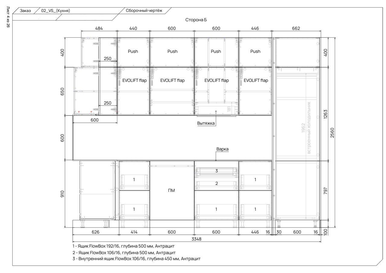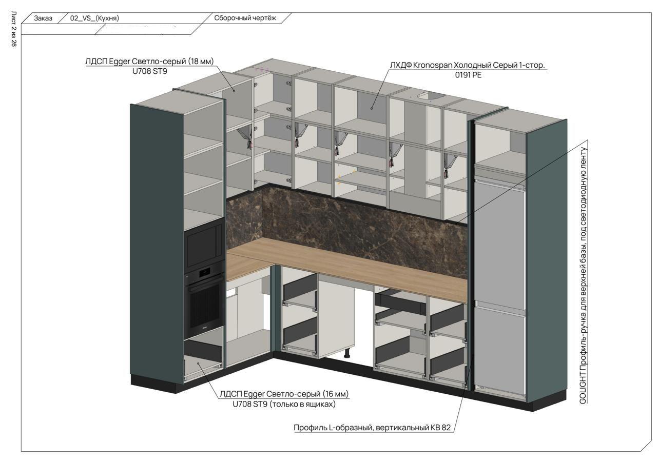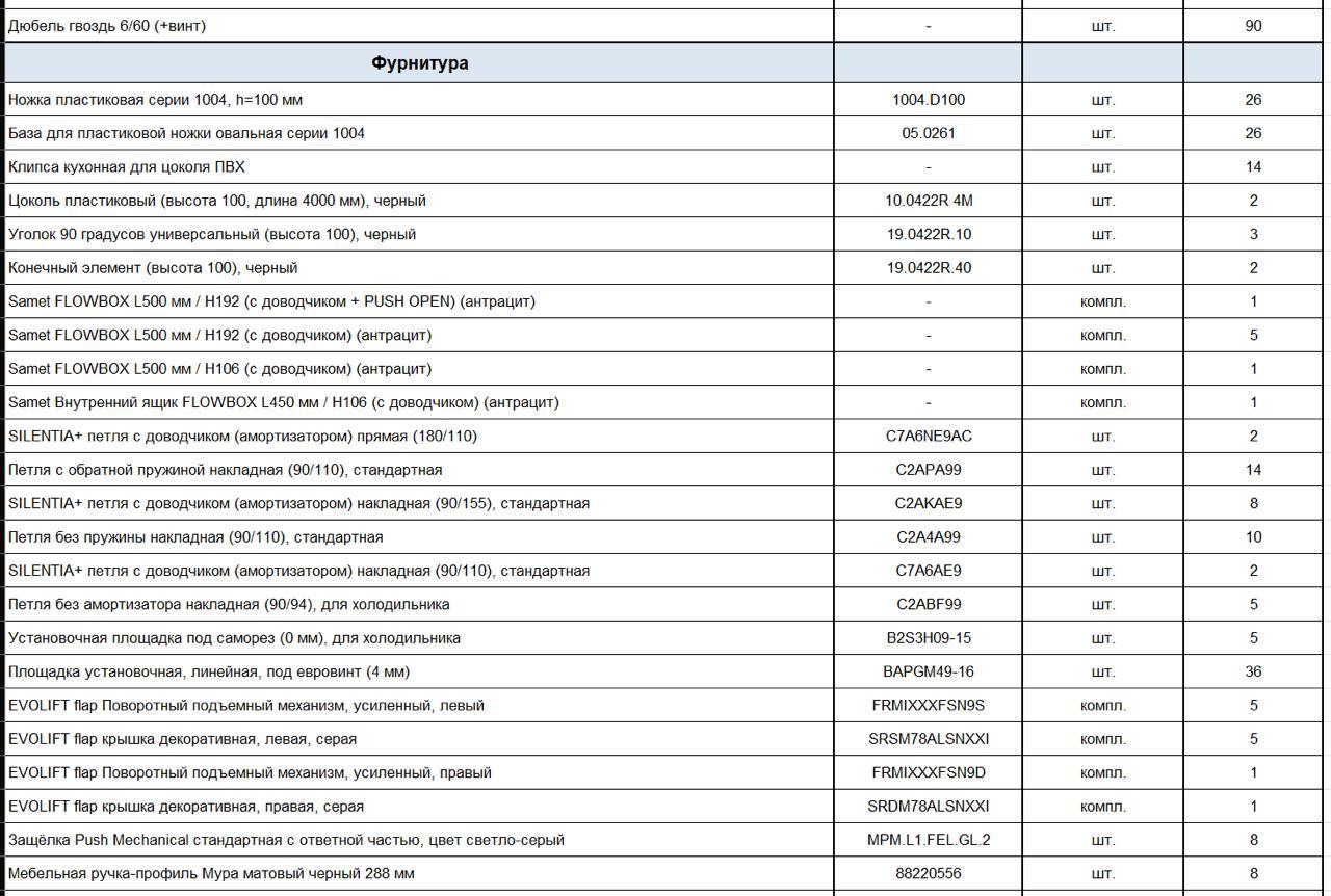 спецификации по материалам, фурнитуре и заказным позициям.